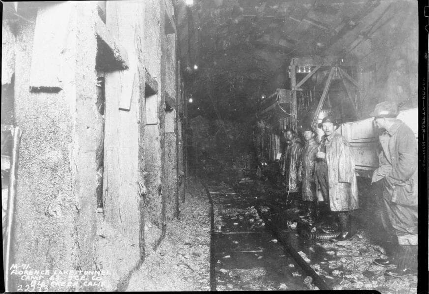 Big Creek, Florence Lake Dam - Miners in Florence Tunnel "Heading Bench, Camp 63, Big Creek".