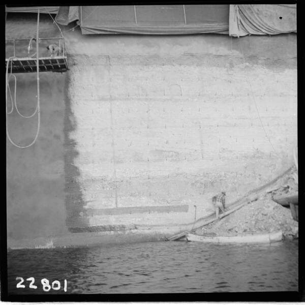Big Creek, Huntington Lake Dams - Dam 1 Upstream face - View showing completed gunite at lower level east end. Lake elevation 6850.5