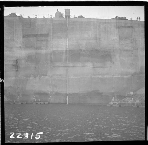 Big Creek, Huntington Lake Dams - Dam 1 Upstream face - View showing completed gunite at lower level east end. Lake elevation 6850.5
