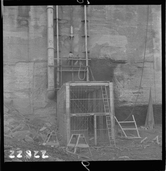 Big Creek, Huntington Lake Dams - View looking east toward intake trash rack, showing gunite repair on upstream face. Corresponds to photo #7 in W.L. Chadwick's report dated 4/4/1942.
