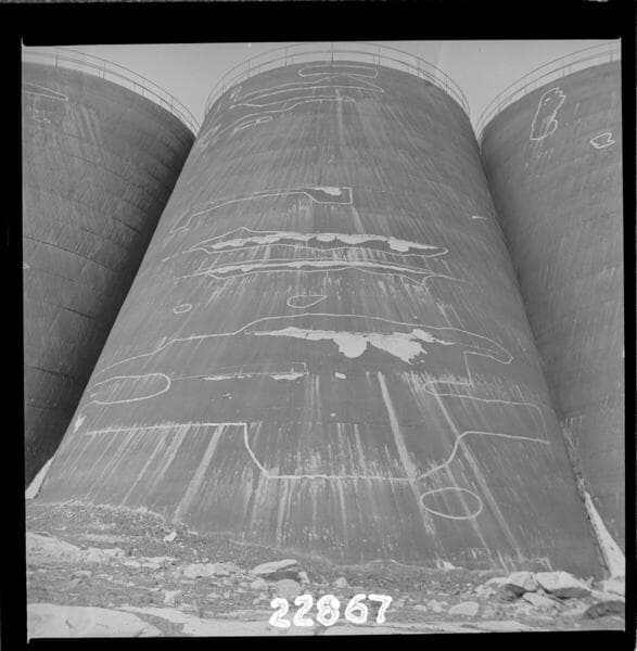 Big Creek, Florence Lake Dam - Arch #52 after extrados inspection. Marked day's work joints had been chipped preparatory to guniting when this photo was taken.