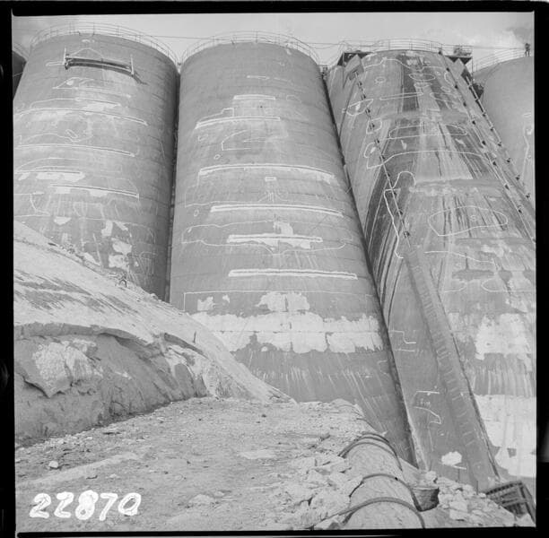 Big Creek, Florence Lake Dam - Day's Work Joint Repair April 1940. Guniting on Arch 13 and chipping on Arch 14.