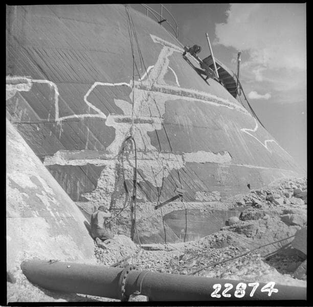 Big Creek, Florence Lake Dam - Day's Work Joint Repair April 1940. Chipping seams on Arches #40 & 41.