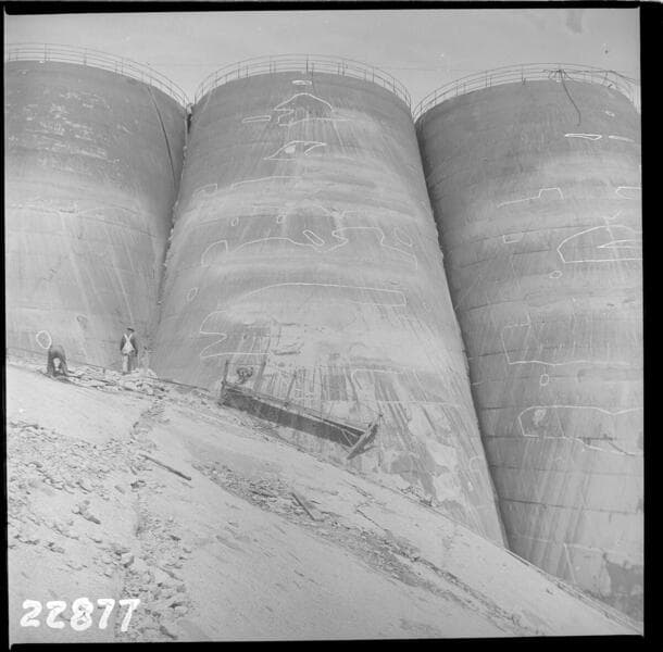 Big Creek, Florence Lake Dam - Day's Work Joint Repair April 1940. Chipping seams on Arch #13.
