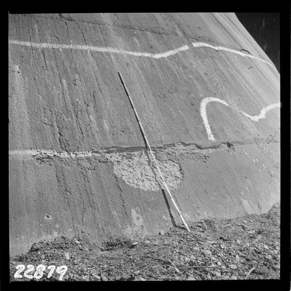Big Creek, Florence Lake Dam - Day's Work Joint Repair April 1940. No. 5 of cycle of 7: Close-up of chipped joint with caulking compound in place ready for guniting.