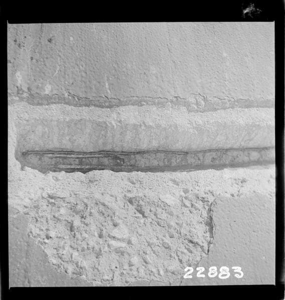 Big Creek, Florence Lake Dam - Day's Work Joint Repair April 1940. The following 7 negatives show the complete cycle of operations in repairing a typical joint. No. 1: Close-up of seam on Arch #17, elevation 7264, prior to any work. This particular seam was selected on account of accessibility for photographing.