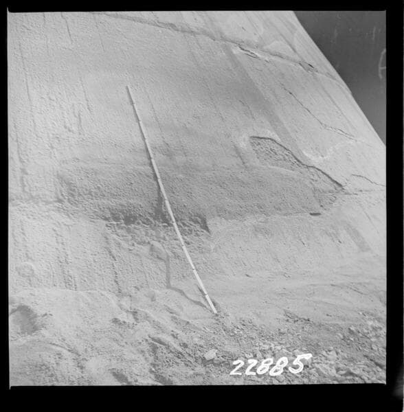 Big Creek, Florence Lake Dam - Day's Work Joint Repair April 1940. The following 7 negatives show the complete cycle of operations in repairing a typical joint. No. 1: Close-up of seam on Arch #17, elevation 7264, prior to any work. This particular seam was selected on account of accessibility for photographing.