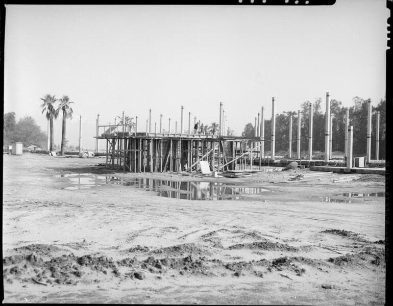 CEP General Office, Rialto - with construction site sign declaring construction of the new Calif. Electric Power Company's, General Headquarters building