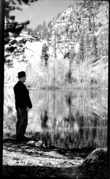 Big Creek Huntington Lake Dams - Winter scenes - Nellie Lake [Man standing in snow by lake looks like David Redinger.]
