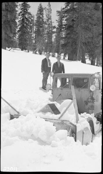 Big Creek, Florence Lake Dam - Snow road near Camp 61, Florence Lake project. Building at right is the sawmill.