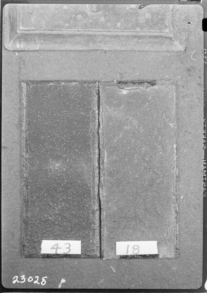 T2 Testing - 35 - Pioneer Asphalt Emulsion after 21 cycles in Weatherometer. Stephenson R.M.S. Aluminum Paint. 42 - Carbozite after 14 cycles in Weatherometer, Carbozite Aluminum Paint.