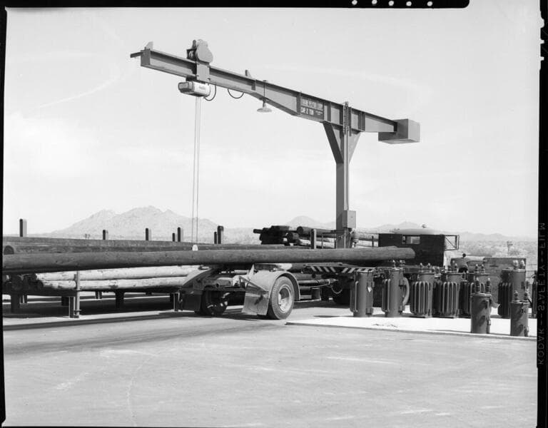 Corona Service Center - crane at pole yard used for lifting poles and equipment onto service vehicles.