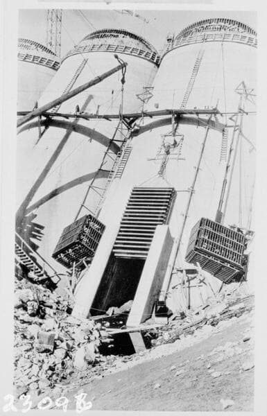 Big Creek, Florence Lake Dam - Progress on multiple-arch dam construction, in River Section showing 300' Tower, Mixer Plant in center and sluice gate at bottom of Arch #53.]
