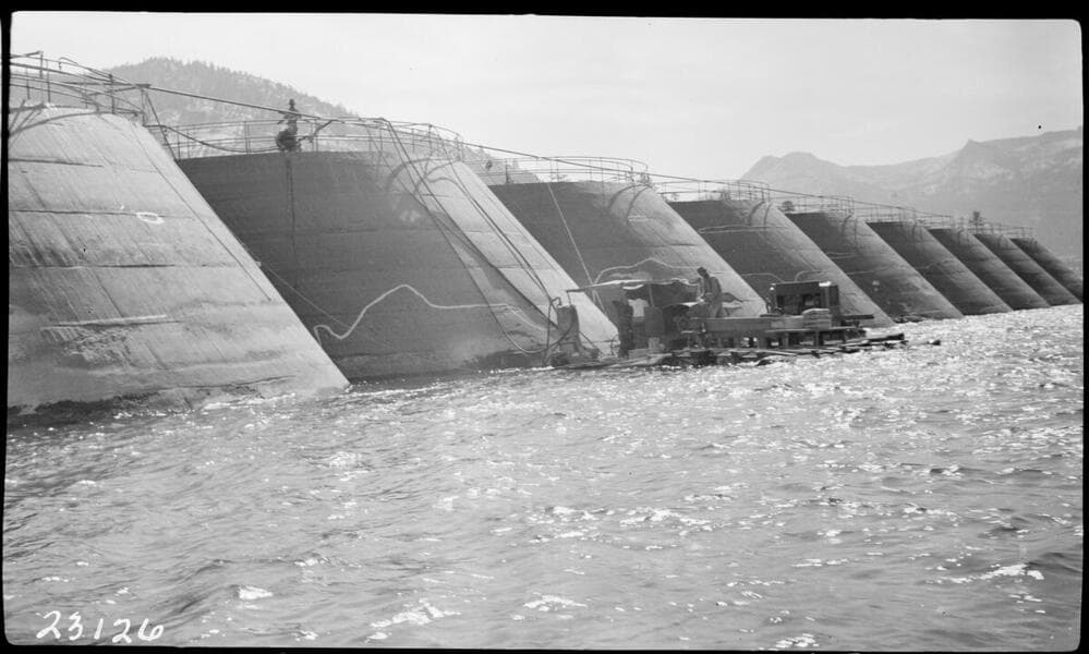 Big Creek, Florence Lake Dam - walkway repair - showing gunite machine.
