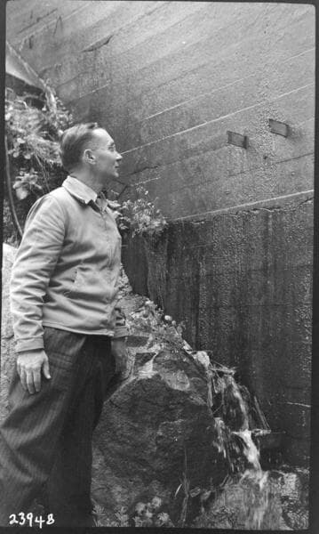 Big Creek, Stevenson Creek Test Dam - 2 men standing at top of chair-lift rails at Stevenson Test Dam. One could be Mr. Ward.