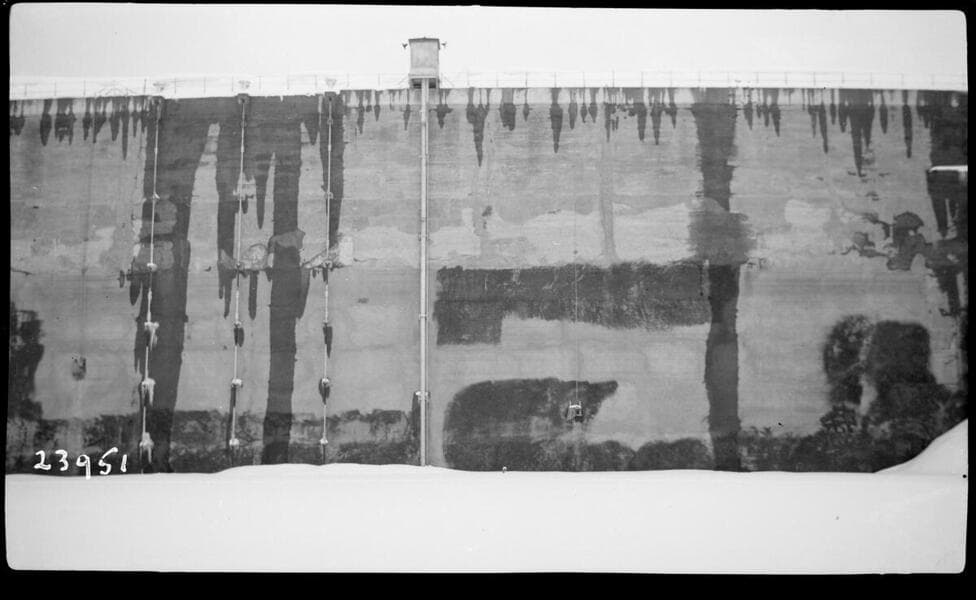 Big Creek, Huntington Lake Dams - Dam 3, upstream face on south end where top drainage has been changed. Dry except for 2' near top. Blur caused by drifting snow.
