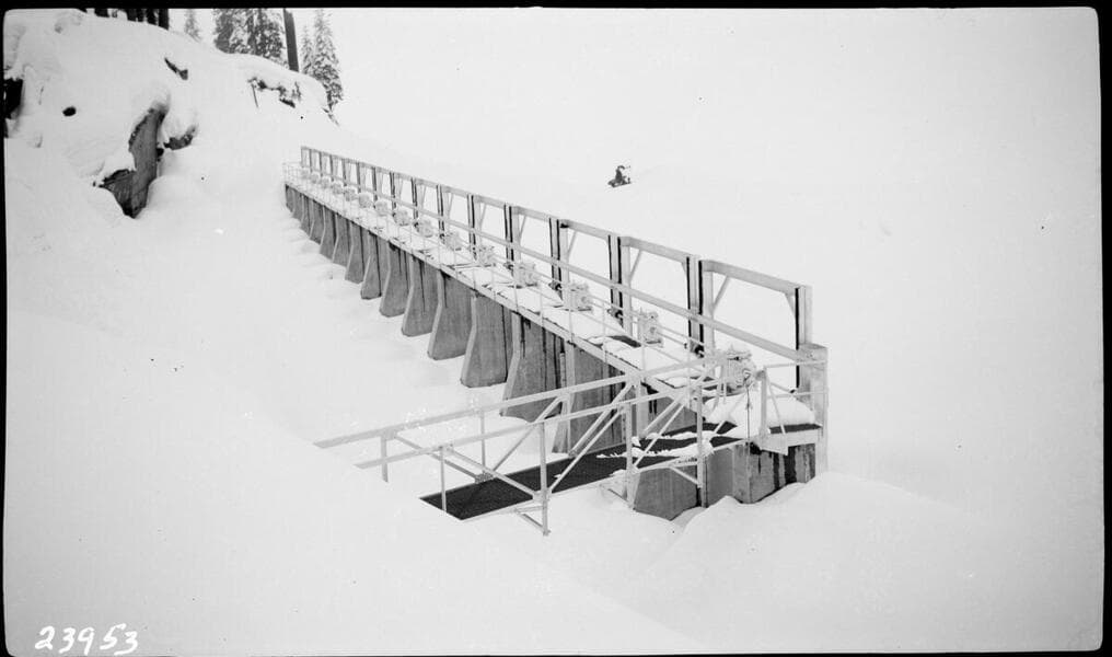 Big Creek, Huntington Lake Dams - Dam #1. East dividing wall in spillway, 1937 construction.