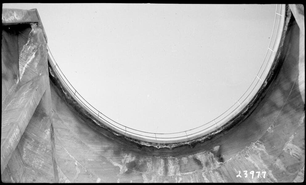 Big Creek, Florence Lake Dam - Construction of Florence Lake Dam using Insley Chute System for delivery of concrete. Looking toward Frog Pond section.