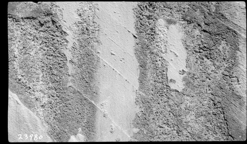 Big Creek, Florence Lake Dam - Close-up of original surface of arch underneath gunite near crown of Arch #20. Original surface chipped free of Intertol. Concrete perfectly sound and dry. .