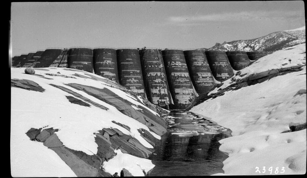 Big Creek, Florence Lake Dam - River Section showing snow drifts in arches.