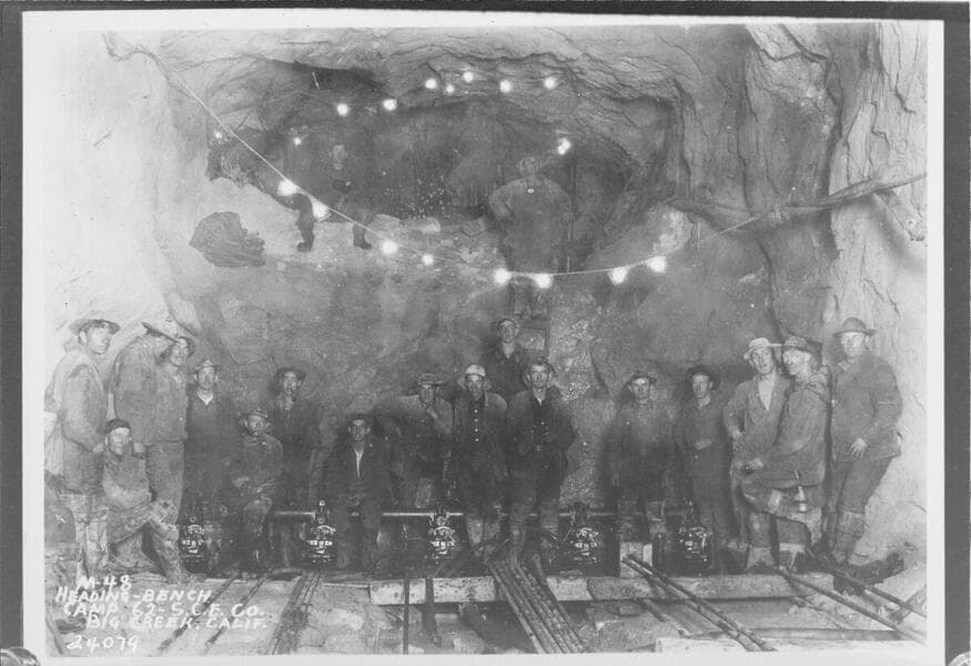 Big Creek, Florence Lake Dam - Miners in Florence Tunnel "Heading Bench, Camp 63, Big Creek".