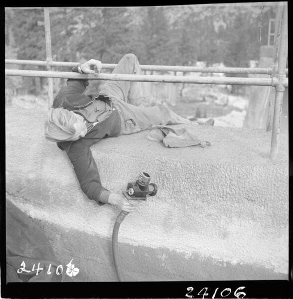 Big Creek, Florence Lake Dam - Close-up showing application of 15# felt and final coat of plastic on Arch No. 52. Johns-Manville waterproofing being applied by the J.H. Bryant Co. [variant of 02-24820a].