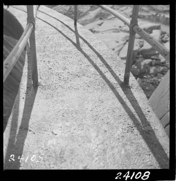 Big Creek, Florence Lake Dam - Arch #13 - Showing top course of sheets bent over in upper horizontal key at edge of walkway.