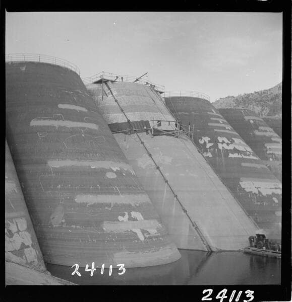 Big Creek, Florence Lake Dam - Arches 52 & 53 after completion of work. Arch 52 completely gunited. Arch 53, above elev. 7296 covered with Barrett Waterworks enamel and below with two coats of raw linseed oil and one coat of aluminum paint. The Barrett enamel was applied in Dec. 1941.