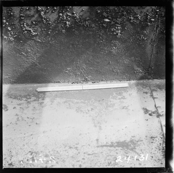 Kaweah #2 - 2 Flume - Close-up of floor after brushing rust and scale off of old steel sheet lining. Note rust holes through lining.
