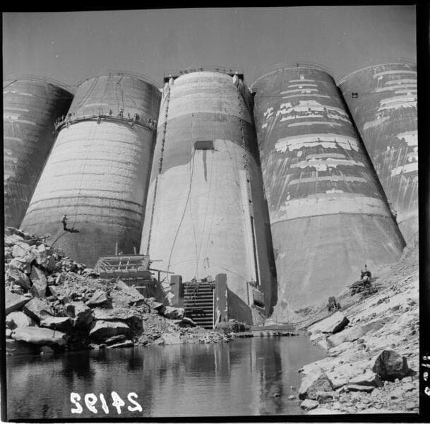 Big Creek, Florence Lake Dam - Record photo of River Section arches. Johns-Manville waterproofing on all arches except Arch No. 53. Upper portion of Arch 53 is covered with Barrett Waterworks enamel. The lower portion is linseed oil treatment over gunite with reflective coating of aluminum.