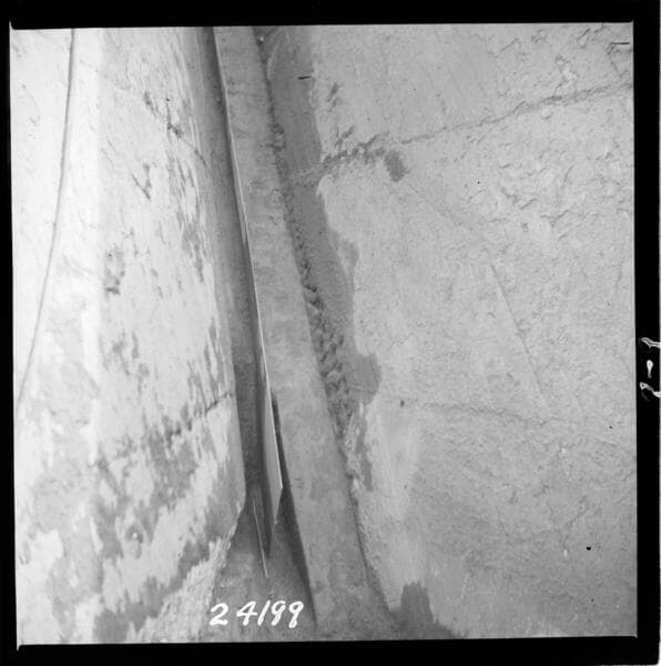 Big Creek, Florence Lake Dam - Close-up of gunite key at base of Arch #13, showing evidence of back leakage. Gunite key was covered with asbestile on November 25, 1942.