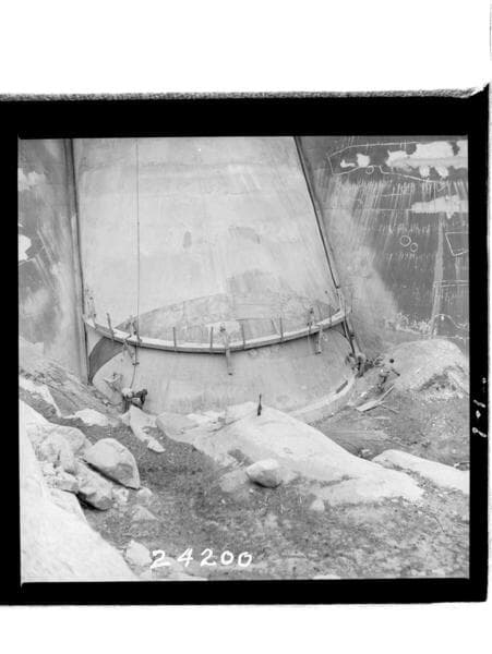 Big Creek, Florence Lake Dam - Arch #13 - Placing sheets on anchor bolts. Steel facing on arch.
