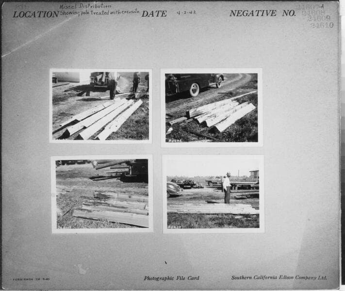 Miscellaneous Distribution - showing pole treated with creosote using pressure grease gun. [plus three additional similar shots (#24612, #24613, & #24614) on same photocard].