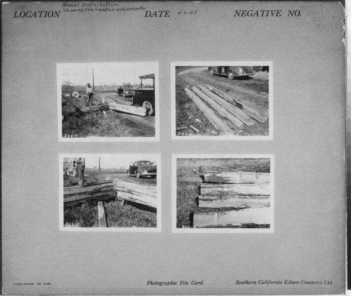 Miscellaneous Distribution - showing pole treated with creosote using pressure grease gun. [plus three additional similar shots (#24608, #24609, & #24610) on same photocard].