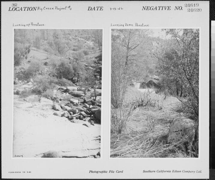 Big Creek Powerhouse #4 - Photo taken at site before any construction was started. Madera County side at dam site looking up river. Temporary water line for core drills just visible.