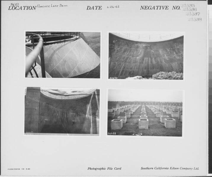 Big Creek, Florence Lake Dam - Record photo of upstream face of Arches 11 to 25 inclusive in second tangent. Arch #13 covered with sheet steel membrane during June 1942 and Arch #12 covered with J-M Asbestile waterproofing during Nov. 1942.