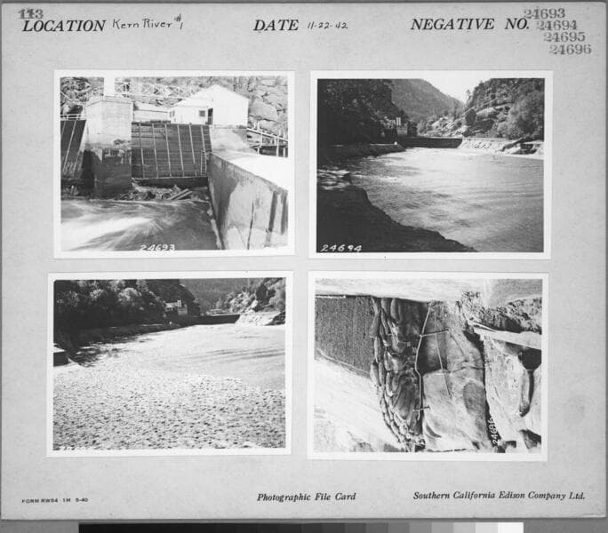 Kern River No. 1 - Undermined rack foundation - at KR1 intake [plus 2 additional similar shots (#24690 & #24691) and one shot showing method of concrete placement for repairs (#24692) on same photocard] .