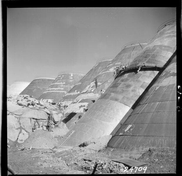 Big Creek, Florence Lake Dam - Arch #13 - Placing sheets on anchor bolts. Steel facing on arch.