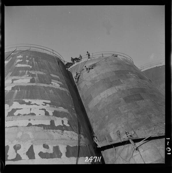 Big Creek, Florence Lake Dam - Arch #13 Placing steel sheets on arch. Burning hole in sheet for anchor bolt.