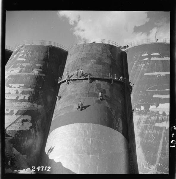 Big Creek, Florence Lake Dam - Arch #13 Skylining 5'x8' sheets from ground to scaffold. Steel facing on arch.