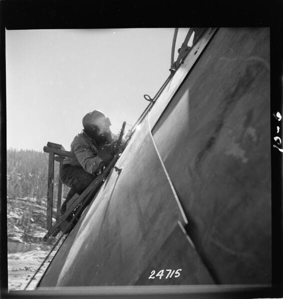 Big Creek, Florence Lake Dam - Arch #13 Skylining 5'x8' sheets from ground to scaffold. Steel facing on arch.