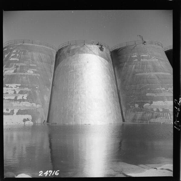 Big Creek, Florence Lake Dam - Arch #13 progress picture showing installation of steel facing. Welding completed on lower portion.