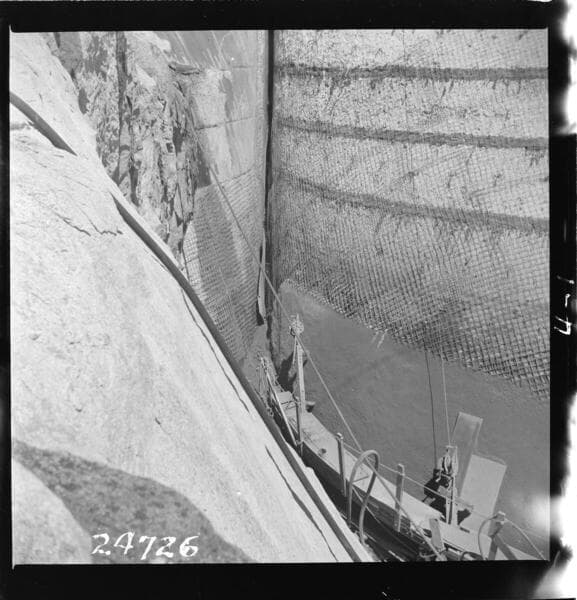 Big Creek, Florence Lake Dam - Cutting bottom key at base of Arch 54 preparatory to 4" gunite coating to elevation 7235.