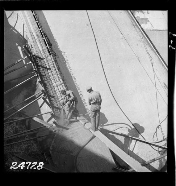 Big Creek, Florence Lake Dam - Progress on multiple-arch dam construction, in River Section showing 300' Tower, Mixer Plant in center and sluice gate at bottom of Arch #53.]