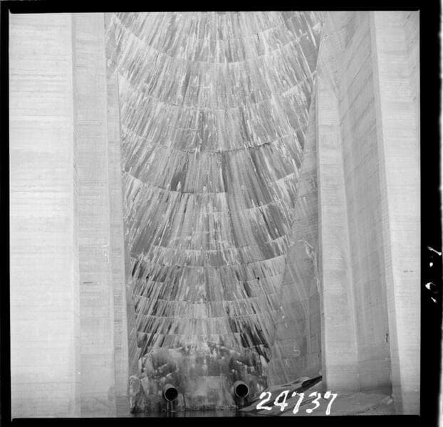 Big Creek, Florence Lake Dam - Record photo of upstream face of Arches 50 to 58 inclusive in fifth tangent. All arches except 53 coated with J-M Asbestile waterproofing during Dec. 1942.