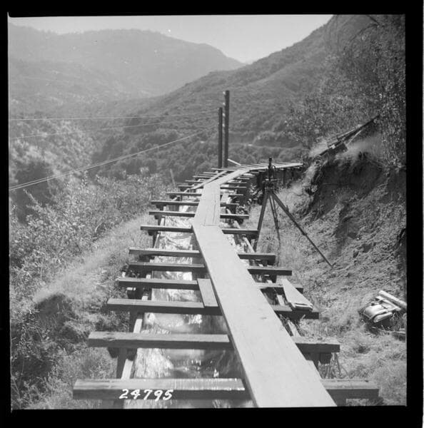 Kaweah #1 - Kaweah #1 Flume - View of old flume under full flow. Looking upstream at approximate Sta. 90-90. .