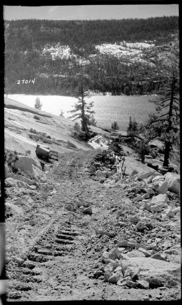 Big Creek Gen'l - Tombstone Creek - Pipeline, looking down 40% grade on "Cat" road.