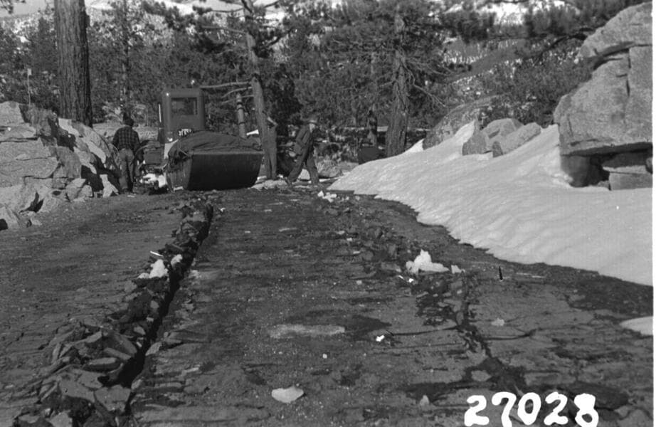 Big Creek, Florence Lake Dam - Sno-Motor from Camp 61c taking Men and supplies on first trip to Florence Lake.
