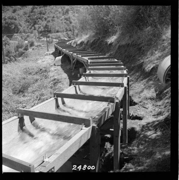 Kaweah #1 - Kaweah #1 Flume - View of old flume under full flow. Looking upstream from lower end of test section at Sta. 91-60.