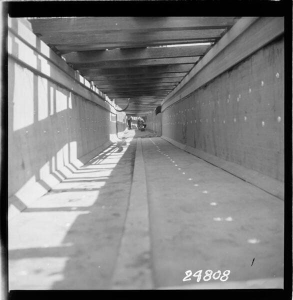 Kaweah No. 2 - Flume - Record photo showing test sheets painted with varying coats of Bitumastic #50 and Asphalt Emulsion, placed on the floor and part of sidewall. Near upper end of flume section No. 1.
